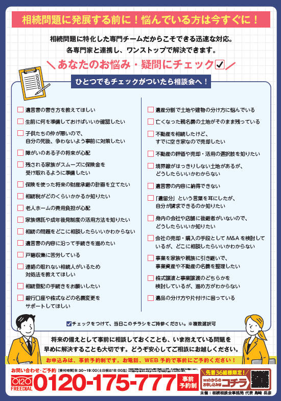 相続のセミナーや記事の配信などを通じ、お客様に身近に感じていただけるサービスを提供しております。 ご満足いただけるまで何度でも話し合い、一人一人のご希望に合わせたご提案を致します。